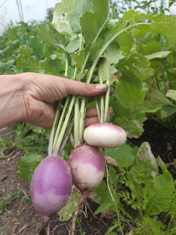 The turnip belongs to the cabbage plants and grows very fast.This large round turnip is half white / half purple. It has very strong leaves, which are also edible. The flesh of the turnip is very fresh, tender and has a slightly sharp taste. You can eat the turnip cooked or raw.